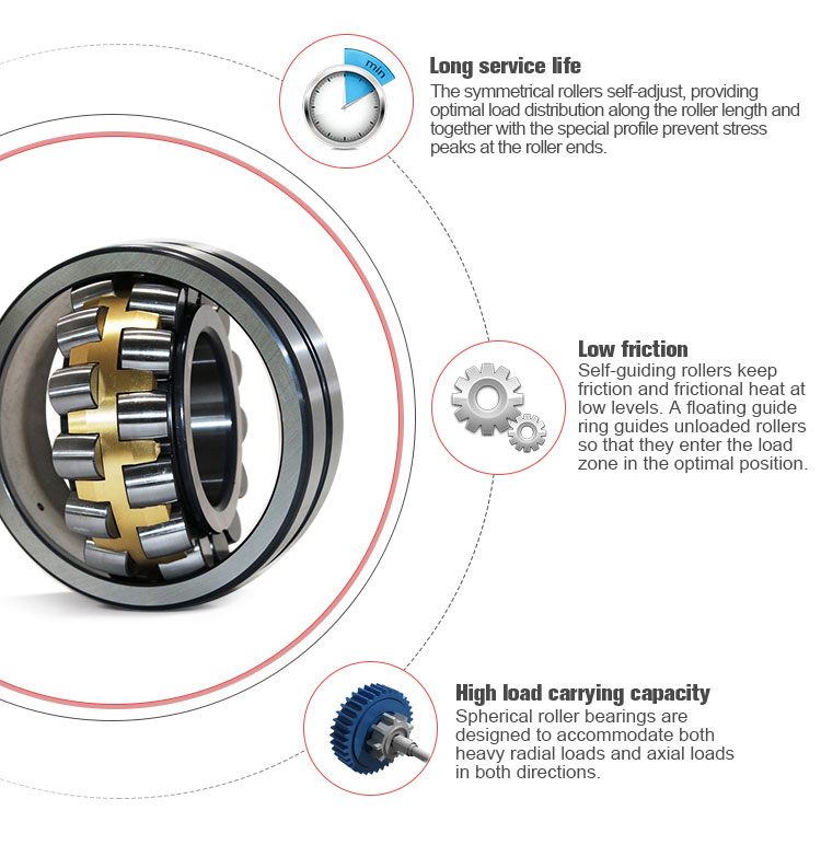 గోళాకార రోలర్ బేరింగ్‌లు రెండు వరుసల సిమెట్రిక్ రోలర్‌లను కలిగి ఉంటాయి, ఒక సాధారణ గోళాకార బాహ్య రింగ్ రేస్‌వే మరియు బేరింగ్ అక్షానికి కోణంలో వంపుతిరిగిన రెండు అంతర్గత రింగ్ రేస్‌వేలు ఉంటాయి.ఔటర్ రింగ్ రేస్‌వేలో గోళం యొక్క కేంద్ర బిందువు బేరింగ్ అక్షం వద్ద ఉంది.