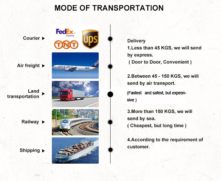 2) 45 - 200 KGS మధ్య, మేము విమాన రవాణా ద్వారా పంపుతాము.(వేగవంతమైన మరియు సురక్షితమైన, కానీ ఖరీదైనది)